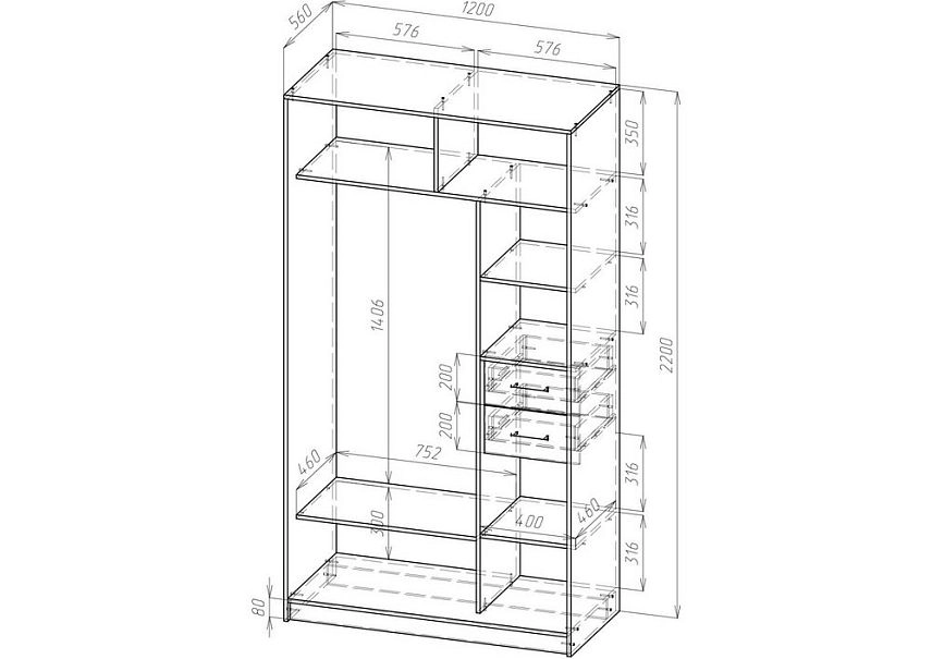 3. Если высота шкафа превышает 2200 мм, рекомендуется добавить дополнительную полку в секцию с полками.