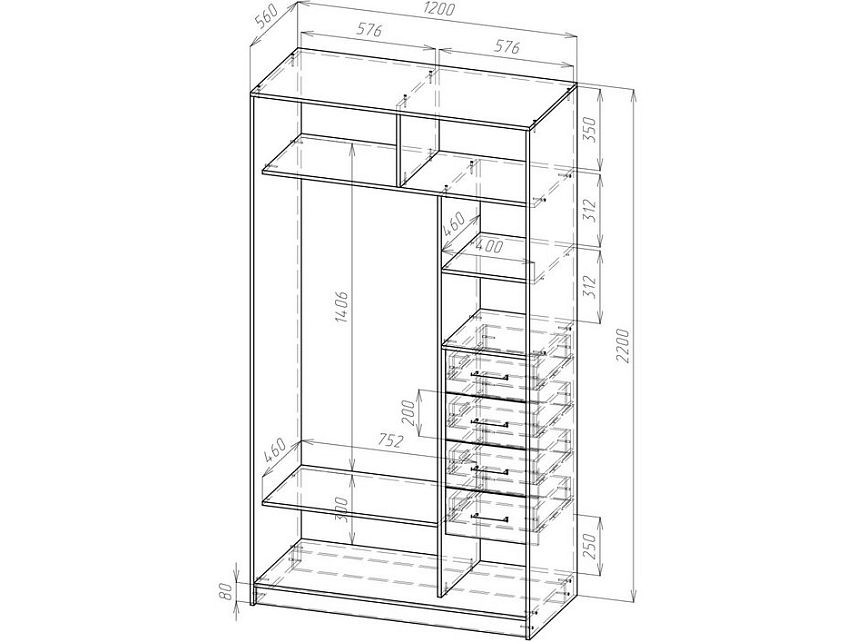 3. Если высота шкафа превышает 2200 мм, рекомендуется добавить дополнительную полку в секцию с полками.