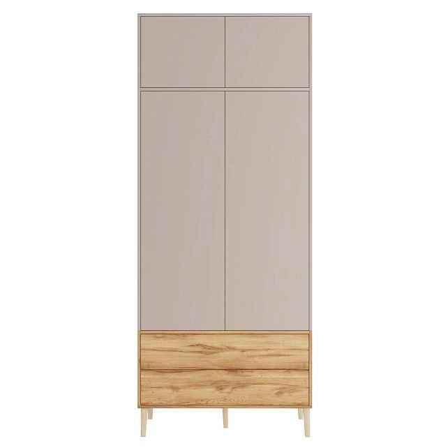 Наполнение: антресольная полка / П (выдвижной кронштейн) / Б (3 полки) / 2 ящика, петли без доводчика, направляющие 100 % выдвижения без доводчика, система открывания Push-to-open, опора массив дерева Н=150мм