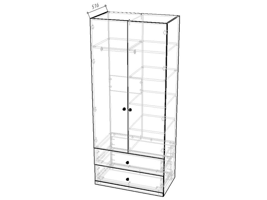Комплектация: наполнение: П (полка под шляпы + штанга) / Б (4 полки) / 2 ящика, шариковые направляющие 100% выдвижения без доводчика, петли без доводчиков